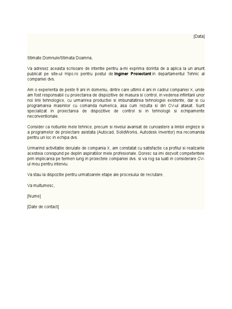 Scrisoare De Intentie - Inginer
